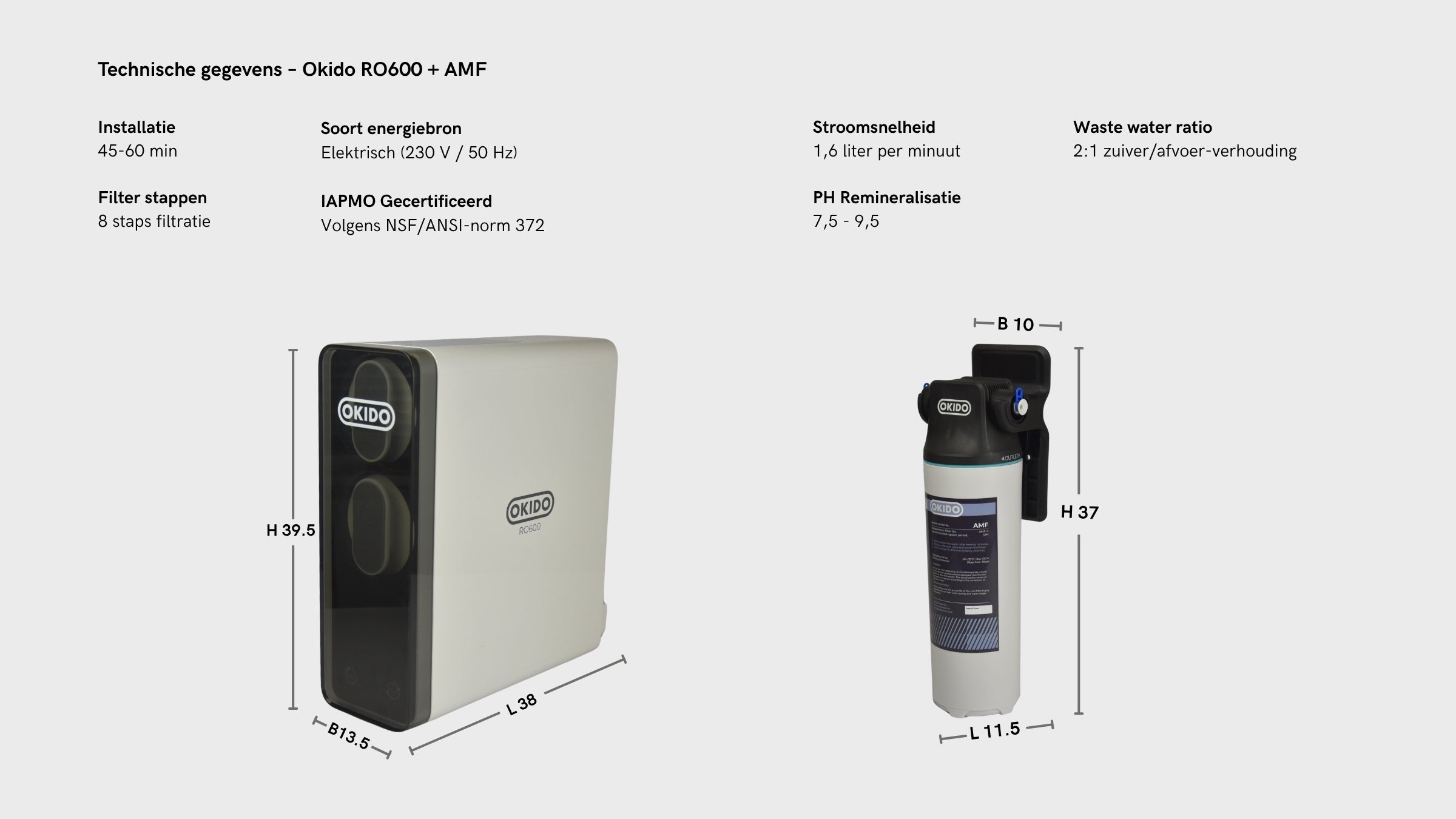 De RO600 heeft een hoogte van 39,5 cm en de AMF-filter is 37 cm hoog. Zie de afbeelding hieronder voor alle afmetingen. De meeste standaard keukenkastjes onder een gootsteen bieden voldoende ruimte. Je hebt ook een stopcontact nodig in het kastje - dit is in de meeste keukens op te lossen met een verlengsnoer via de aansluiting achter de vaatwasser.